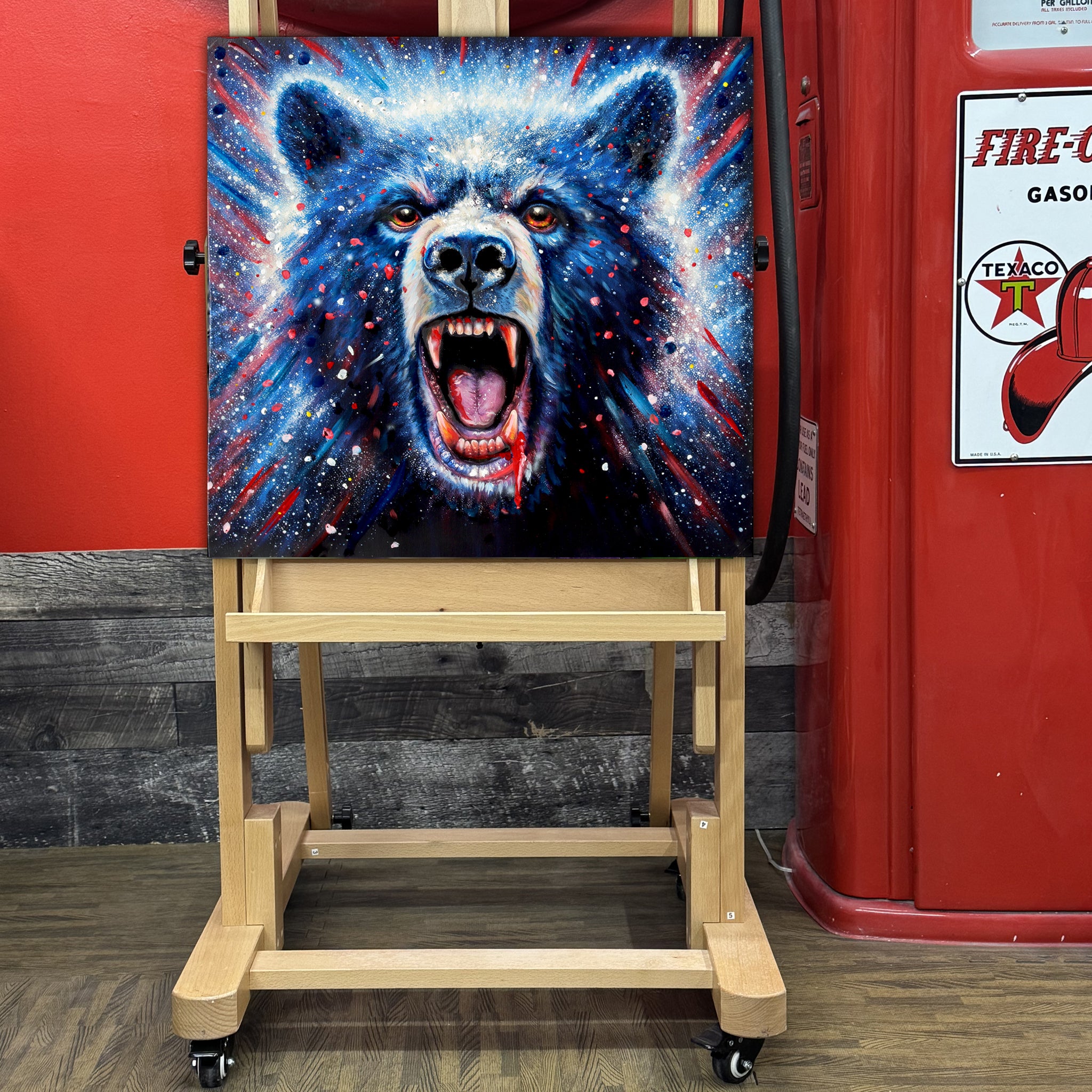 In Pantry Bear, Tutty channels this chaotic midnight feast into a cosmic explosion of reds, blues, whites, and flying paint. The bear’s roar captures equal parts hunger, confusion, and sugar-induced madness. Its fur glows with nebula-like color bursts, giving the creature a surreal, otherworldly energy — as if the universe itself is erupting behind him.