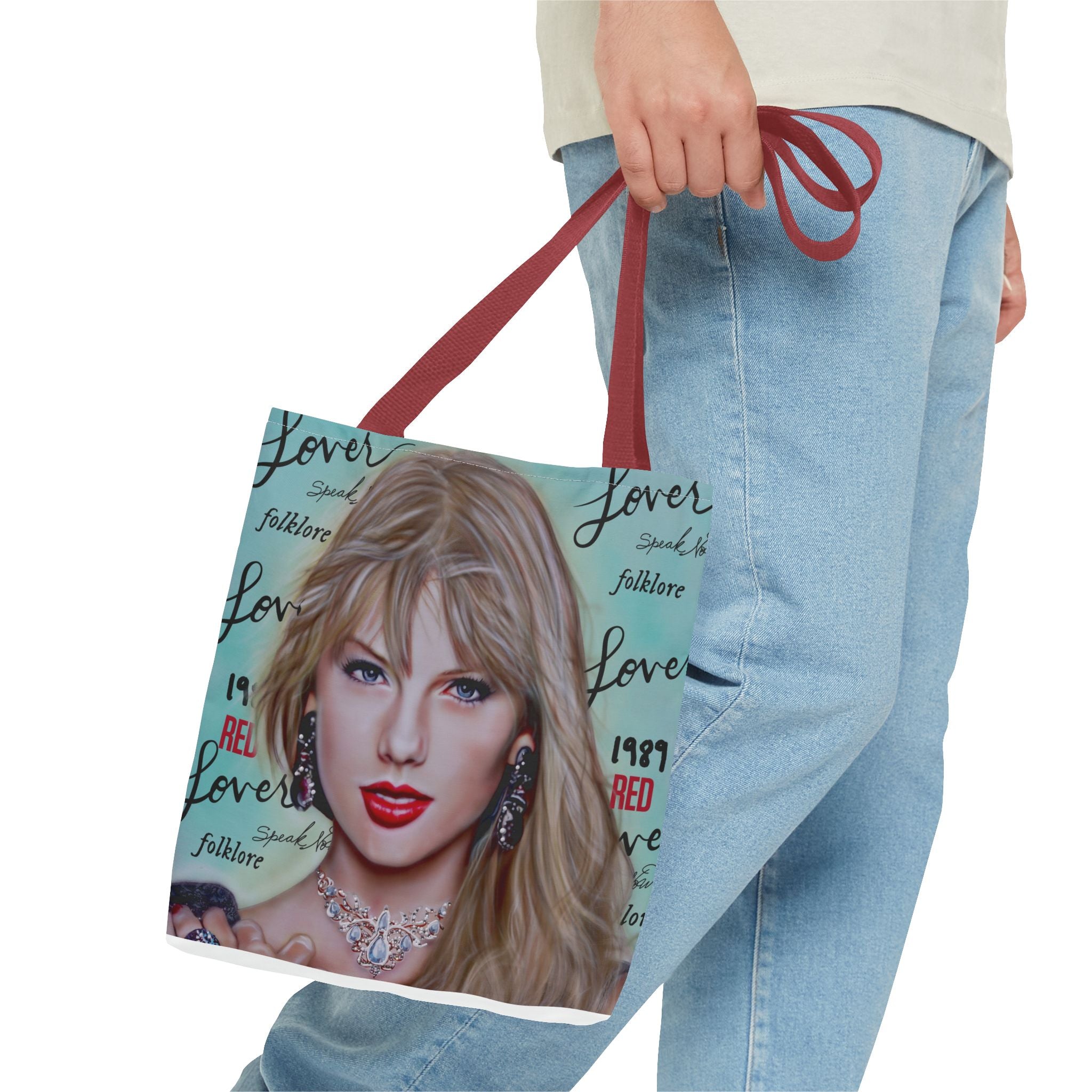 A vibrant, roomy tote that carries personality as easily as your essentials. Soft aqua tones meet hand-painted portrait art and retro logo graphics for a playful, fashion-forward look. The medium-weight polyester holds structure while feeling lightweight, and boxed corners add usable depth for books, groceries, or a weekend change of clothes. Black cotton handles and reinforced stitching mean this bag travels well — from daily commutes to coffeeshop work sessions. Subtle script and nostalgic badge details give the design a boutique, collector’s vibe that will resonate with fans of bold, artist-driven accessories.